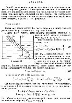 Тонкий, изготовленный из неоднородного по плотности материала стержень длиной I с поперечным сечением S и массой т плавает в наклонном положении, так как к одному его концу привязан тяжелый груз, лежащий на дне сосуда. Где расположен центр тяжести стержня и какая его часть торчит над водой, если нить натянута с силой Т (см. рисунок)? |