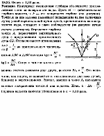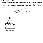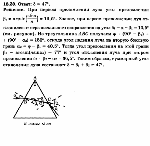 Преломляющий угол призмы ф = 45°. Луч света выходит из призмы под тем же углом, под каким он в нее входит; при этом луч отклоняется от первоначального направления на угол d = 25°. Определите показатель преломления n материала призмы? |