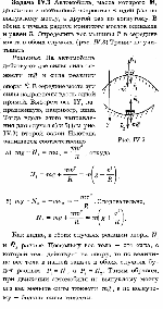 Автомобиль, масса которого М, движется с постоянной скоростью v один раз по выпуклому мосту, а другой раз по вогнутому. В обоих случаях радиус кривизны мостов одинаков и равен R. Определить вес машины Р в середине моста в обоих случаях, (рис. IV.3) Трение не учитывать. |