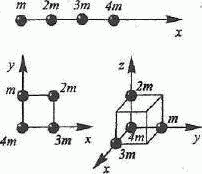 Определите положение центра масс системы, состоящей из четырех шаров, массы которых равны соответственно m, 2m, 3m и 4m, в следующих случаях: а) шары расположены на одной прямой; б) шары расположены по вершинам квадрата; в) шары расположены по четырем смежным вершинам куба. Во всех случаях расстояние между соседними шарами равно 15 см. Направление координатных осей показано на рисунке.