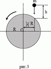 Цилиндр массой М = 2 кг и радиусом R = 8 см вращается вокруг горизонтальной оси О с угловой скоростью ω1 = 2 рад/с так, как показано на рисунке 3. На боковую поверхность цилиндра с высоты h = 0,5 м падает, как показано на рисунке, пластилиновый шарик массой m = 50 г. Какую угловую скорость ω2 будет иметь цилиндр после неупругого удара шарика о цилиндр?