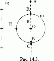 В соответствии с условием задачи 14.23 найти напряженность и потенциал электрического поля в точке А, лежащей так, как показано на рис.14.3. Из задачи 14.23: радиус сферы R = 2 см, плотность заряда сферы σ1 = –3,54 мкКл/м2, плотность заряда плоскости σ2 = 885 нКл/м2, потенциал плоскости φ = 104 В.