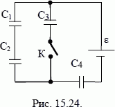 В схеме, изображенной на рис. 15.24, от источника тока с Э.Д.С. ε = 36 В заряжается батарея конденсаторов С1 = 4 мкФ, С2 = 5 мкФ, С3 = 2,78 мкФ, С4 = 20 мкФ при разомкнутом ключе К. а) Какова общая энергия всей батареи конденсаторов ? б) Какой заряд протечет от источника, если замкнуть ключ К? в) На сколько изменится при этом энергия конденсатора С4?