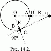 Сферическая поверхность радиусом R = 0,1 м несет равномерно распределенный по ней заряд с поверхностной плотностью σ = 2·10–7 Кл/м2. Вне сферы на расстоянии R от ее поверхности находится точечный заряд q = 4·10–8 Кл (см. рис. 14.2.). Найти напряженность и потенциал электрического поля в центре сферы.