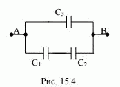 Из трех незаряженных конденсаторов с емкостями С1 = 3 мкФ, С2 = 6 мкФ, С3 = 3 мкФ собрана батарея, схема которой показана на рисунке к задаче 15.4. Каким должно быть начальное напряжение на четвертом конденсаторе с C4 = 15 мкФ, чтобы после его присоединения к батарее напряжение между точками A и В стало равным 150 В? Проверить, выполняется ли закон сохранения энергии при перераспределении начального заряда конденсатора C4 между всеми четырьмя конденсаторами.
