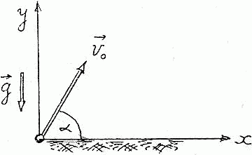 Тело, брошенное под углом α = 60° к горизонту (см. рис.), через время τ = 4 с после начала движения имело вертикальную составляющую скорости vy = 10 м/с. Требуется: 1) написать кинематические уравнения движения тела; 2) вывести уравнение траектории тела; 3) определить дальность L полета тела; 4) найти максимальную высоту Нmax подъема. Тело рассматривать как материальную точку и принять g = 10 м/с2.