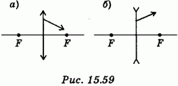 На рисунке 15.59 изображен ход светового луча после прохождения линзы. Найти построением ход луча до линзы. Положение фокусов известно.