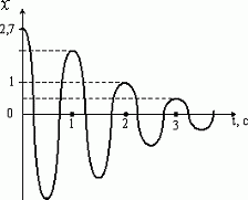 На рисунке изображен график затухающих колебаний, где S — колеблющаяся величина, описываемая уравнением x(t) = A0e–t/τ sin(ω1t + φ). Определите время релаксации τ (в секундах).