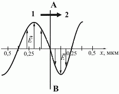 На рисунке представлена мгновенная фотография электрической составляющей электромагнитной волны, переходящей из среды 1 в среду 2 перпендикулярно границе раздела сред АВ. Отношение скорости света в среде 2 к его скорости в среде 1 равно... .