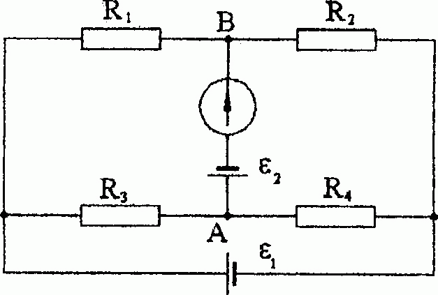Источник тока с ЭДС |ε1| = 6 В и сопротивления R1 = 100 Ом; R2 = 50 Ом; R3 = 40 Ом; R4 = 80 Ом соединены, как показано на рисунке. Какую ЭДС ε2 должен иметь второй источник тока и как он должен быть подключен, чтобы ток через гальванометр не шел? Внутренними опорами источников тока пренебречь.