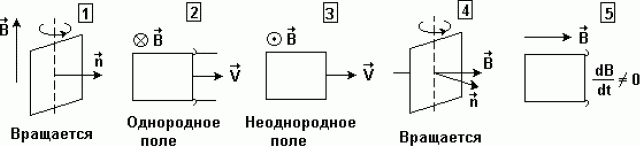 На рисунке приведены различные случаи поведения проводящей рамки в магнитном поле. Укажите номер случая, когда в рамке не возникает ЭДС индукции.