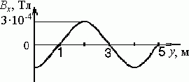 В среде с магнитной проницаемостью μ = 1 и диэлектрической проницаемостью ε = 9 в положительном направлении оси 0у распространяется плоская электромагнитная волна. На рис. приведен график зависимости проекции Вх индукции магнитного поля волна на ось 0х от координаты у в произвольный момент времени t. Определите период Т волны.