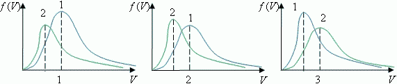На (P,V) - диаграмме показан процесс, производимый идеальным газом в изолированном сосуде. Начальное и конечное состояния будут соответствовать распределениям скоростей, изображенным на рисунке ...