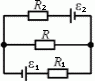 Найти значение и направление тока через сопротивление R (см. рисунок), если ε1 = 0,5 В, ε2 = 2,5 В, R1 = 20 Ом, R2 = 40 Ом, R = 42 Ом. Внутренние сопротивления источников пренебрежимо малы.