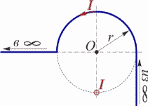 Система состоит из трех бесконечно длинных проводников (см. рисунок), один из которых изогнут, а два остальных имеют прямолинейную форму. Найти магнитную индукцию в т.O, если r = 1 см, I = 1,6 А.