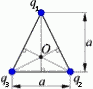 В вершинах треугольника находятся заряды q1 = q3 = 2 нКл и q2 = –9 нКл. Определить напряженность электрического поля в т.O (см. рис.), если а = 13 см.