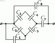 Определить электроемкость батареи конденсаторов (см. рис.): C1 = 1 пФ, C2 = 1 пФ, С3 = 1 пФ, C4 = 4 пФ, C5 = 2 пФ, С6 = 0,82 пФ, С7 = 0,2 пФ.