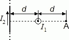 По двум скрещенным под прямым углом бесконечно длинным проводам текут токи I1 = 100 А и I2 = 200 А. Определите магнитную индукцию в точке А. Расстояние d = 10 см.