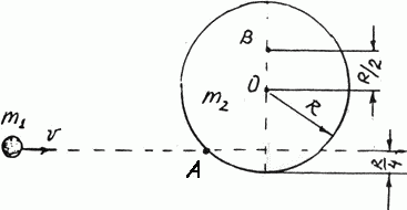 Однородный диск может свободно вращаться вокруг горизонтальной оси, проходящей через его центр О. В точку А на образующей диска попадает горизонтально летящий маленький пластилиновый шарик и прилипает к его поверхности. Скорость v шарика равна 10 м/с. Определить линейную скорость u точки В на диске в начальный момент времени. Масса m1 шарика равна 10 г. Масса m2 диска равна 0,1 кг.