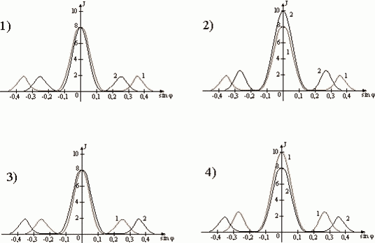 На дифракционную решетку падает излучение с длинами волн λ1 и λ2. Укажите номер рисунка, иллюстрирующего положение главных максимумов, создаваемых дифракционной решеткой, при λ2 < λ1 и J2 > J1? (J — интенсивность, φ — угол дифракции).