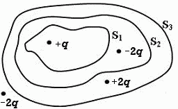 Дана система точечных зарядов в вакууме и замкнутые поверхности S1, S2 и S3. Через какие поверхности поток вектора напряженности электростатического поля будет равен q/ε0?