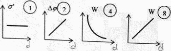 На рисунке 1, 2, 4, 8 изображены графики зависимости поверхностной плотности σ' зарядов, разности потенциалов Δφ и энергии W электрического поля плоского конденсатора от расстояния d между обкладками. Какие из них относятся к случаю, когда конденсатор отключен от источника питания? Укажите сумму их номеров.