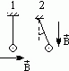 В однородном магнитном поле (В = 0,2 Тл), линии которого направлены горизонтально и вправо, подвешен на двух невесомых проволочках горизонтальный проводник (рис.1) длиной l = 20 см. По нему пропускают ток I1 (ток направлен на нас), проводник оказывается невесомым. 1) При массе проводника равной 0,04 кг, сила тока I1, текущего по нему, равна … 2) Если линии будут направлены вертикально вниз (рис 2), то при угле отклонения от вертикали в α = 30°, сила тока I2 будет равной ...