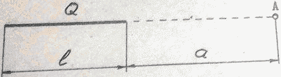Тонкий стержень длины l = 20 см несет равномерно распределенный заряд Q = -0,1 мкКл. Определить: 1) напряженность Е электрического поля, создаваемого распределенным зарядом в точке А, находящейся на расстоянии a = 30 см от конца стержня, 2) силу F, действующую на точечный заряд q = 10 нКл, помещенный в точку А.