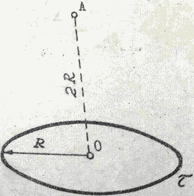 По тонкому кольцу радиуса R = 20 см равномерно распределен с линейной плотностью τ = –0,1 мкКл/м заряд. Определить: 1) напряженность Е электрического поля, создаваемого распределенным зарядом в точке А, находящейся на оси кольца на расстоянии 2R от его центра, 2) силу F, действующую на точечный заряд q = 5 нКл, помещенный в точку А.