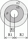 Шар радиусом R1 = 0,3 м с полостью радиусом R0 = 0,1 м, центр которой совпадает с центром шара, заполнен диэлектриком с диэлектрической проницаемостью ε1 и объемной плотностью заряда ρ. Шар окружен сферическим слоем диэлектрика радиусом R2 = 0,6 м, с диэлектрической проницаемостью ε2 (рис. 35). Определить разность потенциалов точек A и B, расположенных на расстояниях rA и rB от центра сферы.