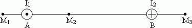 На рисунке изображены сечения двух прямолинейных бесконечно длинных проводников с токами. Расстояние между проводниками AB = 10 см, токи I1 = 20 А и I2 = 30 А. Найти напряженности H магнитного поля, вызванного токами I1 и I2 в точках M1, M2 и M3. Расстояния M1A = 2 см, AM2 = 4 см и BM3 = 3 см.