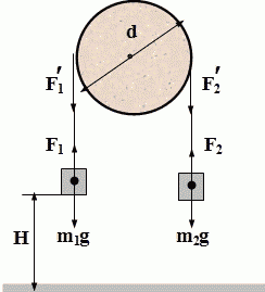 Через блок перекинут легкий шнур к концам которого привязаны грузы массами m1 и m2. Масса блока m, диаметр d. Высота грузов над поверхностью H. Трением пренебречь.