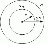 На двух концентрических сферах равномерно распределенный заряд с поверхностными плотностями σ1 = 3σ и σ2 = –σ, где σ = 10 нКл/м2. Радиусы сфер R и 2R, где R = 10 см. Определить напряженность электрического поля в зависимости от расстояния до оси r. Найти зависимость E(r), вычислить E(R1), E(R2), если R1 = 1,5R, R2 = 3R. Построить график зависимости напряженности Е(r).