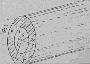 В бесконечном цилиндре радиуса 2R, несущим равномерно распределенный заряд с объемной плотностью ρ = 6 мкКл/м3, сделан соосный, цилиндрический вырез радиусом R. 1. Используя теорему Остроградского-Гаусса, найти выражение для напряженности Е(r) электрического поля в трех областях (I, II, III). 2. Вычислить напряженность Е, поля в точке А, удаленной от оси цилиндра на расстояние τ = 1,5R, и указать направление вектора ЕA. 3. Построить график Е(R) в единицах ρR/ε0. R = 2 см.