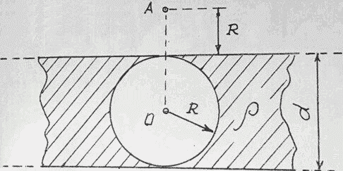 Плоская, бесконечно протяженная пластина, толщиной d = 4 см, несет равномерно распределенный по объему заряд (ρ = 8 нКл/м3). В пластине имеется цилиндрическая полость радиуса R = d/2. Определить по модулю и направлению, напряженность ЕA электрического поля в точке А, лежащей на прямой, перпендикулярной оси цилиндра и плоскости поверхности пластины.