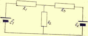 Требуется определить силу тока в сопротивлении R2, если ε1 = 1,5 В, ε2 = 1 В, R1 = 50 Ом, R2 = 100 Ом, R3 = 80 Ом. Внутренними сопротивлениями источников тока пренебречь.