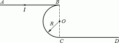 По проводнику, изображенному на рисунке, течёт ток 10 А, радиус изогнутой части 10 см. Найти напряжённость магнитного поля в точке О.