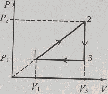 Тепловая машина, рабочим телом которой является идеальный одноатомный газ, совершает цикл, диаграмма которого изображена на рисунке. Р2 = 2Р1, V2 = 2V1. Определить КПД такой тепловой машины η.