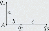 Три заряда q1 = –7, q2 = –7, q3 = 9 нКл расположены как показано на рисунке. Расстояния а = 3 см, b = 3 см, с = 2 см. Определить напряженность и потенциал в точке А.