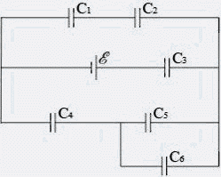 В схеме на рисунке емкости конденсаторов составляют С1 = 13 мкФ, С2 = 6 мкФ, С3 = 14 мкФ, С4 = 15 мкФ, С5 = 7 мкФ, С6 = 29 мкФ. ЭДС источника 120 В. Определить напряжение на конденсаторе С5.