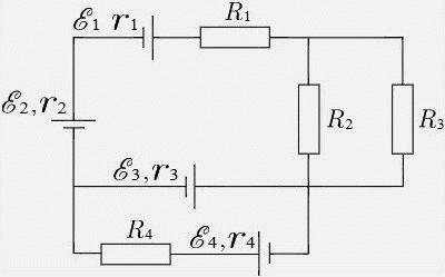 В схеме на рисунке сопротивления резисторов R1 = 90 Ом, R2 = 520 Ом, R3 = 410 Ом, R4 = 330 Ом, ЭДС источников ε1 = 720 В, ε2 = 280 В, ε3 = 300 В, ε4 = 590 В, внутренние сопротивления источников r1 = 20 Ом, r2 = 13 Ом, r3 = 20 Ом, r4 = 16 Ом. Определить напряжение на резисторе R2.