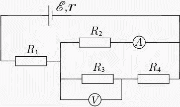 В схеме на рисунке сопротивления резисторов составляют R1 = 460 Ом, R2 = 330 Ом, R3 = 260 Ом, R4 = 390 Ом, R5 = 290 Ом, внутреннее сопротивление источника r = 40 Ом, ЭДС источника ε = 330 В. Определить показания измерительных приборов, если их сопротивления равны соответственно RV = 1200 Ом, RA = 68 Ом.