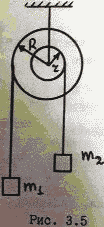 Ступенчатый блок с радиусами R = 2 м и r = 1 м вращается с ускорением β = 0,2 с–2 (см. рис. 3.5). Найти момент инерции блока, если массы грузов m1 = 4 кг, m2 = 1 кг.