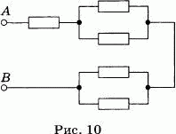 На рисунке 10 показан участок цепи AB. Чему равно сопротивление этого участка, если сопротивление каждого резистора 8 Ом?