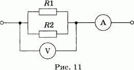 В цепь (рис. 11) включены два резистора сопротивлениями R1 = 8 Ом и R2 = 12 Ом. Вольтметр показывает напряжение 48 В. Определите общее сопротивление цепи, напряжение и силу тока на каждом резисторе, показания амперметра.