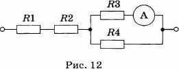 На рисунке 12 изображён участок цепи, содержащий резисторы сопротивлениями R1 = 1 Ом, R2 = 4 Ом, R3 = 2 Ом, R4 = 3 Ом. Амперметр показывает силу тока 6 А. Определите общее сопротивление участка цепи, силу тока и напряжение на каждом резисторе.