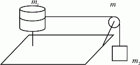 Однородный цилиндр массой т1 = 3 кг может вращаться вокруг вертикальной оси, совпадающей с его осью симметрии. На цилиндр намотана нить, другой конец которой, перекинутый через цилиндрический блок массой т = 2 кг, привязан к грузу массой т2 = 5 кг. Определить ускорение груза, если блок и цилиндр вращаются без трения.