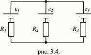 В схеме (рис. 3.4) ЭДС источников ε1 = 1,5 В, ε2 = 2,0 В, ε3 = 2,5 В и сопротивления R1 = 10 Ом, R2 = 20 Ом, R3 = 30 Ом. Внутренние сопротивления источников пренебрежимо малы. Определите: 1) ток через сопротивление R1; 2) тепловую мощность, которая выделяется на сопротивлении R2.