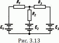 В схеме рис. 3.13 ε1 = ε2 = ε3, R1 = 20 Ом, R2 = 12 Ом в падение потенциала на сопротивлении R2 равно 6 В. Найти силу тока во всех участках цепи. Найти сопротивление R3. Внутренним сопротивлением элементов пренебречь.