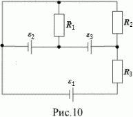 Определите силу токов, протекающих через сопротивления и через источники. Внутреннее сопротивление источников не учитывать. Рис. 10. ε1 = 40 В, ε2 = 50 В, ε3 = 10 В, R1 = 15 Ом, R2 = 30 Ом, R3 = 25 Ом.